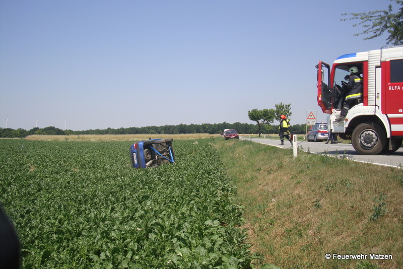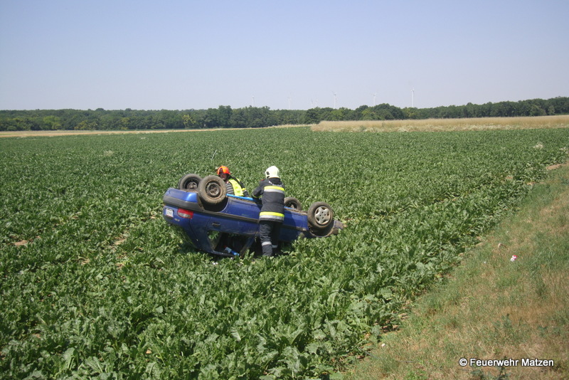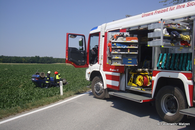 Die Feuerwehr Matzen baute den Brandschutz auf, sicherte die Unfallstelle gegen den nachfolgenden Verkehr ab und stellt das Fahrzeug mittels Seilwinde wieder auf die Räder. Im Anschluss wurde es auf die Straße gezogen und mit Hilfe der Abschleppachse am Feuerwehrgelände gesichert abgestellt.