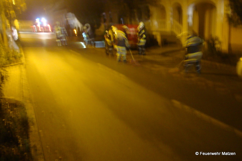 Montagnacht ertönten um 23:02 die Sirenen und rissen die Matzner Einsatzkräfte aus dem Schlaf. Es musste eine Ölspur auf der Hauptstrasse gebunden werden. 11 Mann rückten unverzüglich mit 2 Fahrzeugen zur Einsatzstelle aus. Ein Fahrzeug riss sich beim Befahren der Baustelle am Hauptplatz die Hydraulikleitung am Fahrzeug ab und zog eine ca. 100 Meter lange Ölspur. Nachdem die Betriebsmittel gebunden und die Fahrbahn gereinigt wurde, konnten die Einsatzkräfte nach rund 1 Stunde wieder einrücken und die Einsatzbereitschaft herstellen.