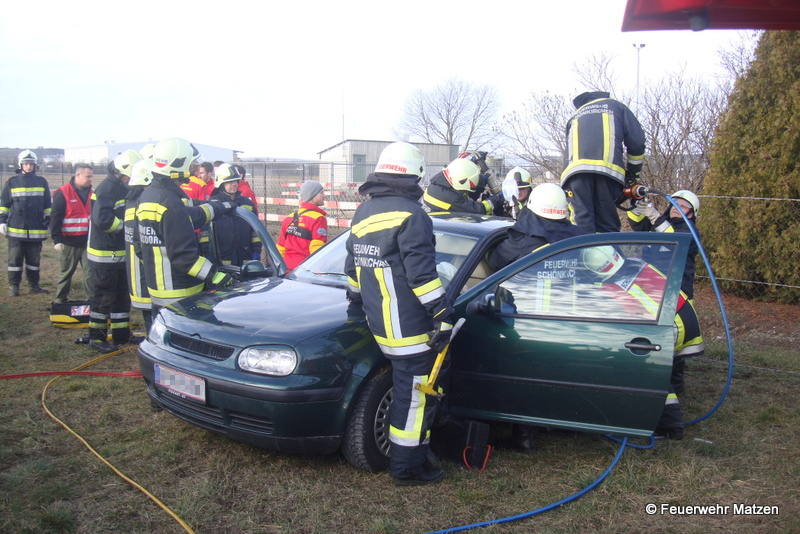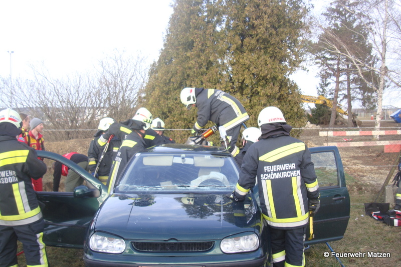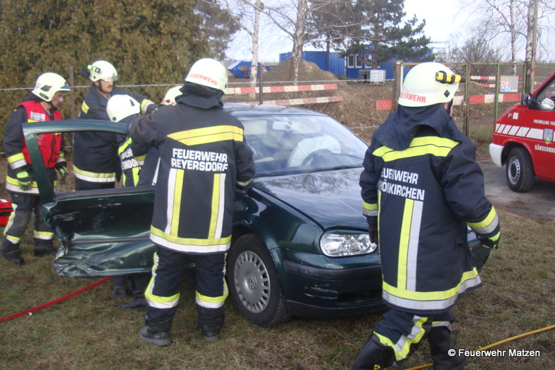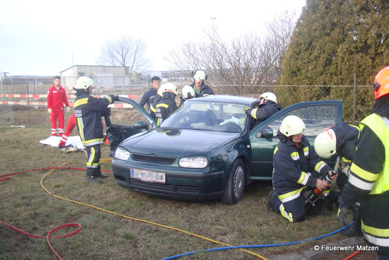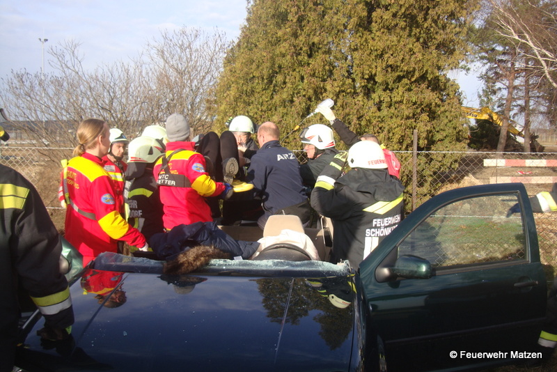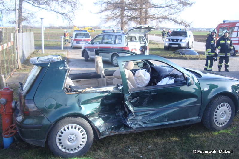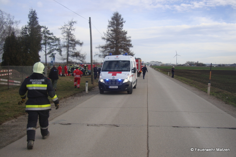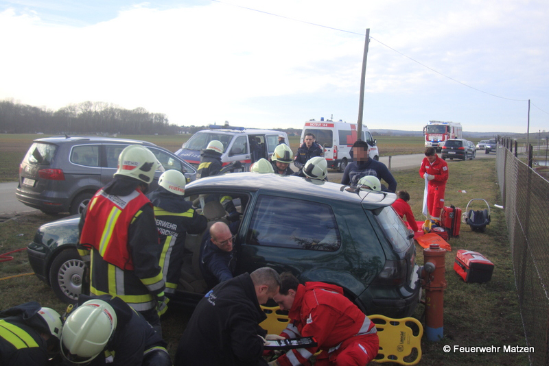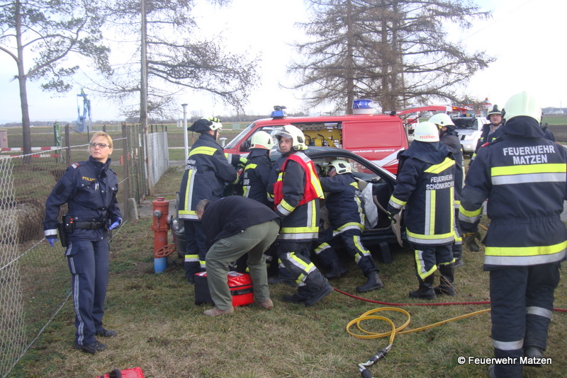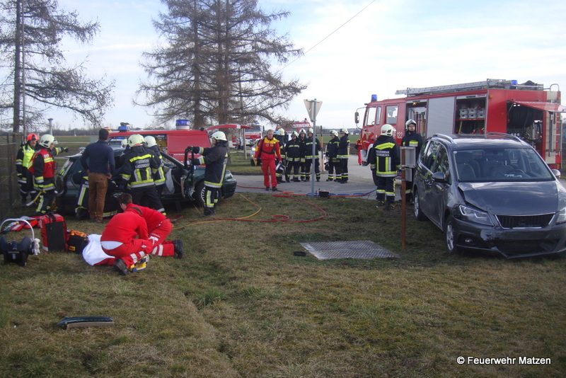 Am 9. Februar 2016 wurde die Feuerwehr Matzen um 14:42 mittels Sirene, Pager und SMS-Alarm zu einem Verkehrsunfall mit einer eingeklemmten Person alarmiert. Gleichzeitig wurden aufgrund der Alarmstufe T2 die Feuerwehren Gänserndorf und Schönkirchen-Reyersdorf alarmiert. Zwei Pkw kollidierten aus bisher ungeklärten Umständen im Kreuzungsbereich, wobei ein Fahrzeug beifahrerseitig getroffen und von der Fahrbahn katapultiert wurde. Dabei wurde eine Person in ihrem Fahrzeug eingeklemmt. Der Fahrer, ein Kleinkind sowie die Fahrerin des anderen Pkw´s konnten die Fahrzeuge aus eigener Kraft verlassen. Am Einsatzort auf der L3159 Richtung Gänserndorf angekommen, bereitete die Feuerwehr Gänserndorf bereits die Menschenrettung vor. Unterstützt wurden sie dabei von der Feuerwehr Reyersdorf-Schönkirchen. Währenddessen unterstützten die Kameraden der Feuerwehr Matzen das Rote Kreuz bei der Versorgung der Verletzten. Nach der Entfernung des Daches konnte die eingeklemmte Beifahrerin dem Team des Notarzthubschraubers C9 übergeben werden. Im Anschluss wurde die Fahrbahn gereinigt und die Unfallfahrzeuge verbracht, ehe die Florianijünger wieder abrücken konnten. Nach rund 1 ½ Stunden konnte die Einsatzbereitschaft wieder hergestellt werden.