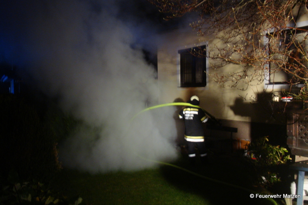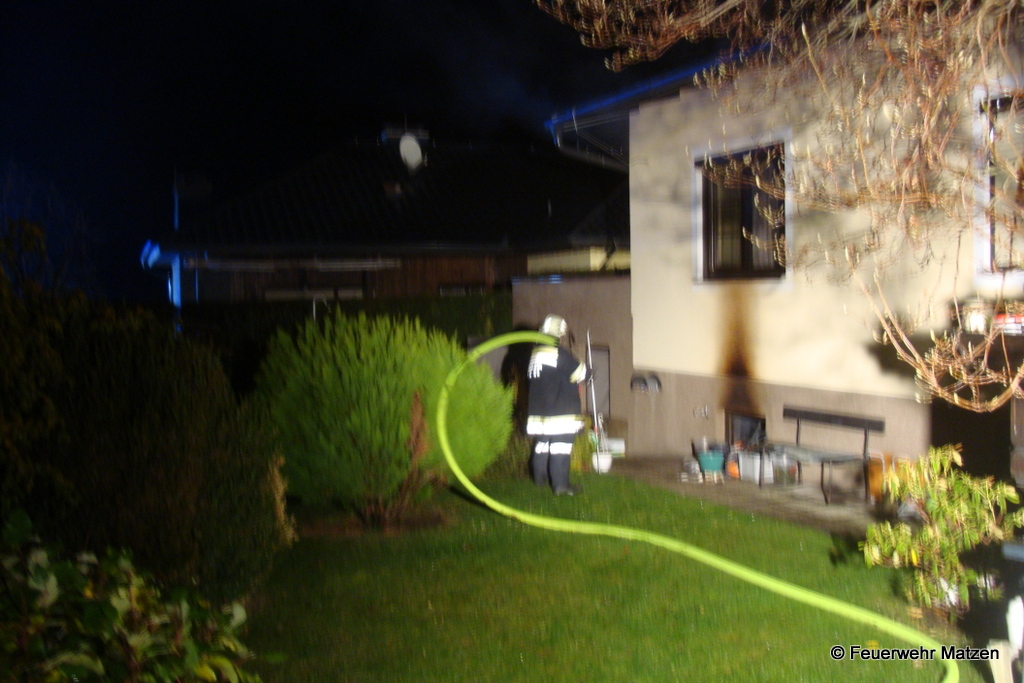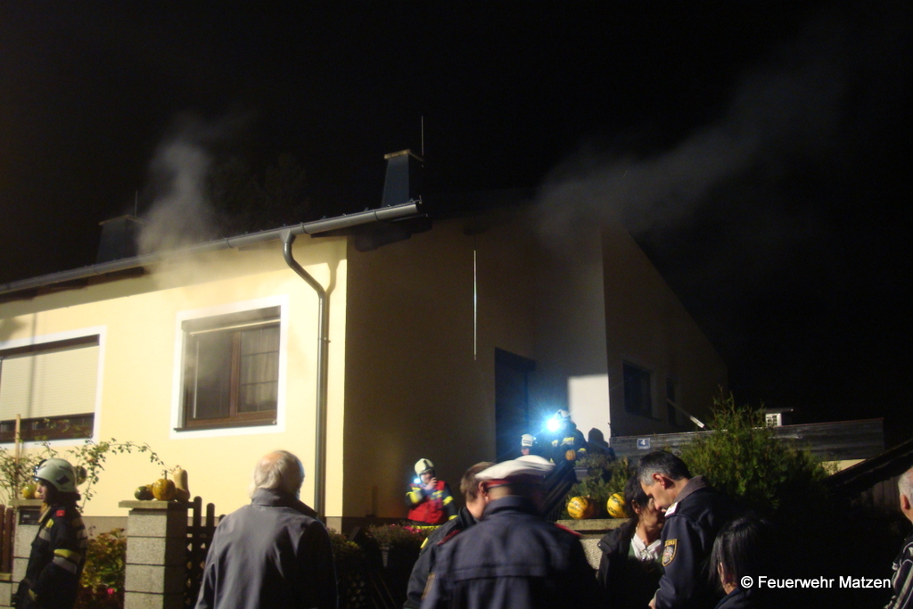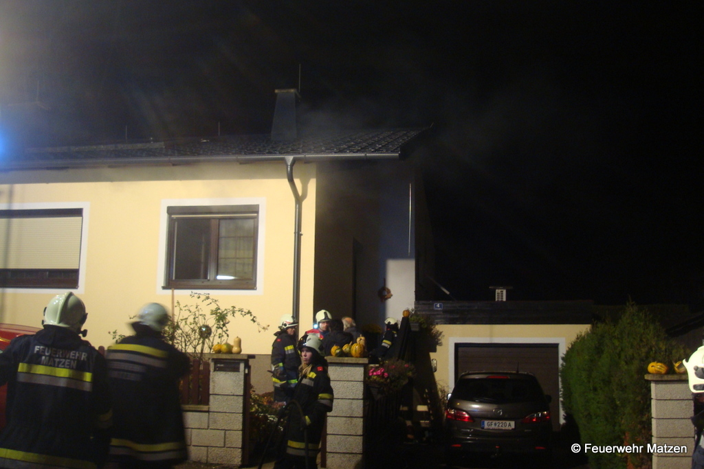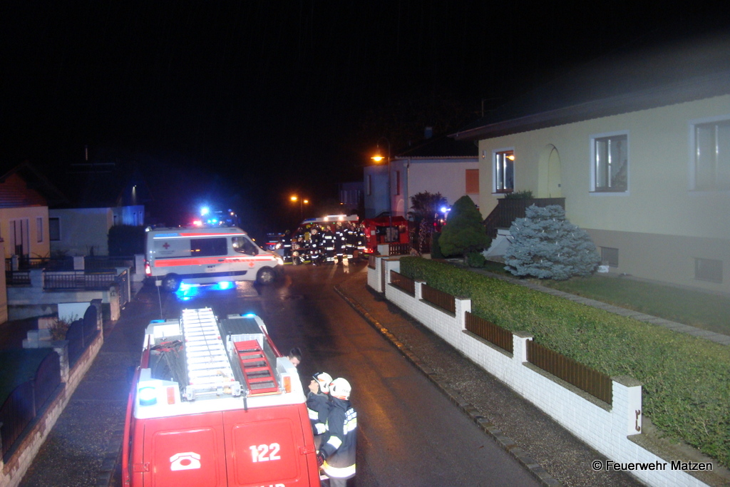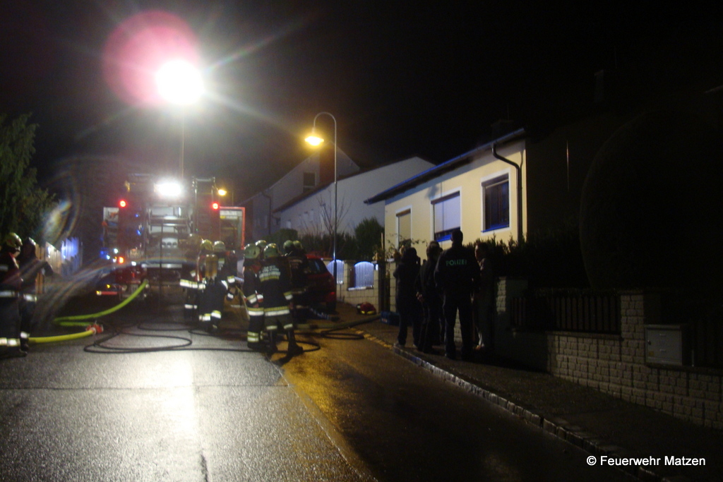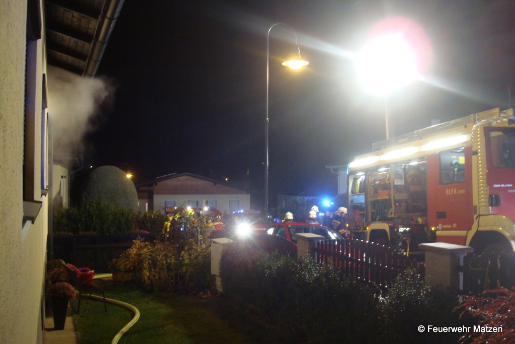 Am 11.11.2017 wurde die Feuerwehr Matzen um 22:11 Uhr mittels Sirene, SMS-Alarm und Pager zu einem Brandverdacht im Matzner Einsatzgebiet alarmiert. Nur 3 Minuten später rückte das erste Fahrzeug zum Einsatzort in der Suttnergasse aus. Bei der Ausrückemeldung bekamen wir weitere Informationen. Es handelte sich um ein komplett verrauchtes Haus, in dem sich niemand mehr aufhalten sollte. Noch während der Anfahrt wurde auf die Alarmstufe B2 erhöht. Angekommen erkundete der Einsatzleiter mit seinem Gruppenkommandanten des ersten Löschfahrzeuges den Unglücksort, wobei ein Brand im Keller vermutet wurde. Unverzüglich wurden die Strom- und Gaszufuhr unterbrochen und der erste Atemschutztrupp rückte mit der Wärmebildkamera in das Brandobjekt vor. Nach der ersten Rückmeldung über starke Hitzeentwicklung und den Vollbrand eines Zimmers im Kellergeschoß, wurde die Alarmstufe unverzüglich auf B3 erhöht, da mit einem Einsatz von mehreren Atemschutztrupps ausgegangen werden musste. In der Zwischenzeit wurde ein Außenangriff in Stellung gebracht, um den Innenangriff durch ein geborstenes Fenster zu unterstützen. Die aufgebaute Einsatzleitung koordinierte nachfolgende Kräfte und ließ einen Atemschutzsammelplatz aufbauen und die Löschwasserversorgung sicherstellen. Die weiteren Atemschutztrupps wurden jeweils von einem Atemschutzgeräteträger der örtlichen Feuerwehr mittels Wärmebildkamera unterstützt. Durch die Kenntnisse über das Brandobjekt konnte so eine kontinuierliche Brandbekämpfung sichergestellt werden. Nachdem alle Brandherde lokalisiert und abgelöscht wurden, konnte mit der Druckbelüftung gestartet werden. Nach einer erneuten Kontrolle mittels Wärmebildkamera konnte Brandaus gegeben werden. Insgesamt standen 5 Feuerwehren mit 14 Fahrzeugen und 94 Mann im Einsatz. Die Feuerwehr Matzen möchte sich an dieser Stelle bei allen Einsatzkräften für die gute Zusammenarbeit und Unterstützung bedanken. Nachdem das geborstene Fenster provisorisch geschlossen wurden, konnten die Florianijünger nach über 3 Stunden wieder abrücken und die Einsatzbereitschaft herstellen.