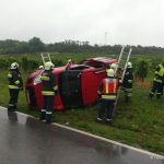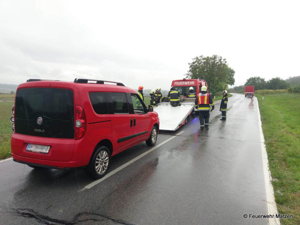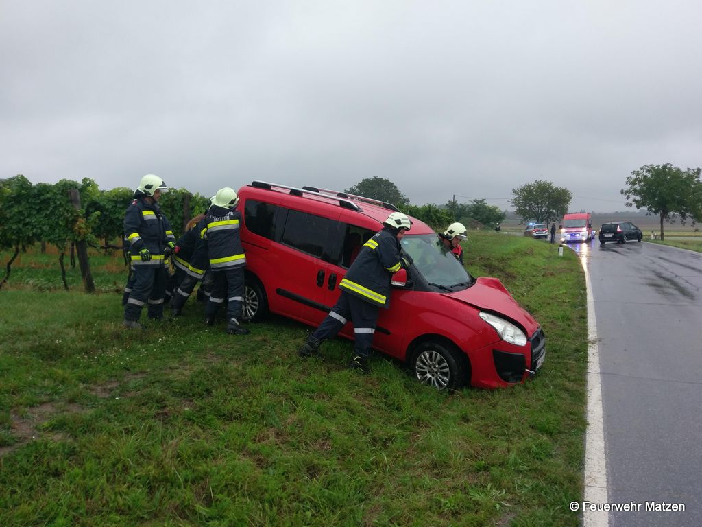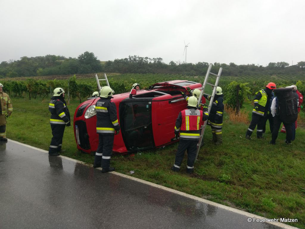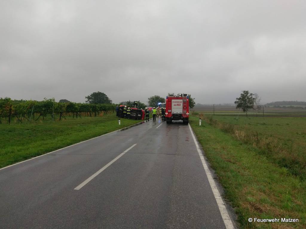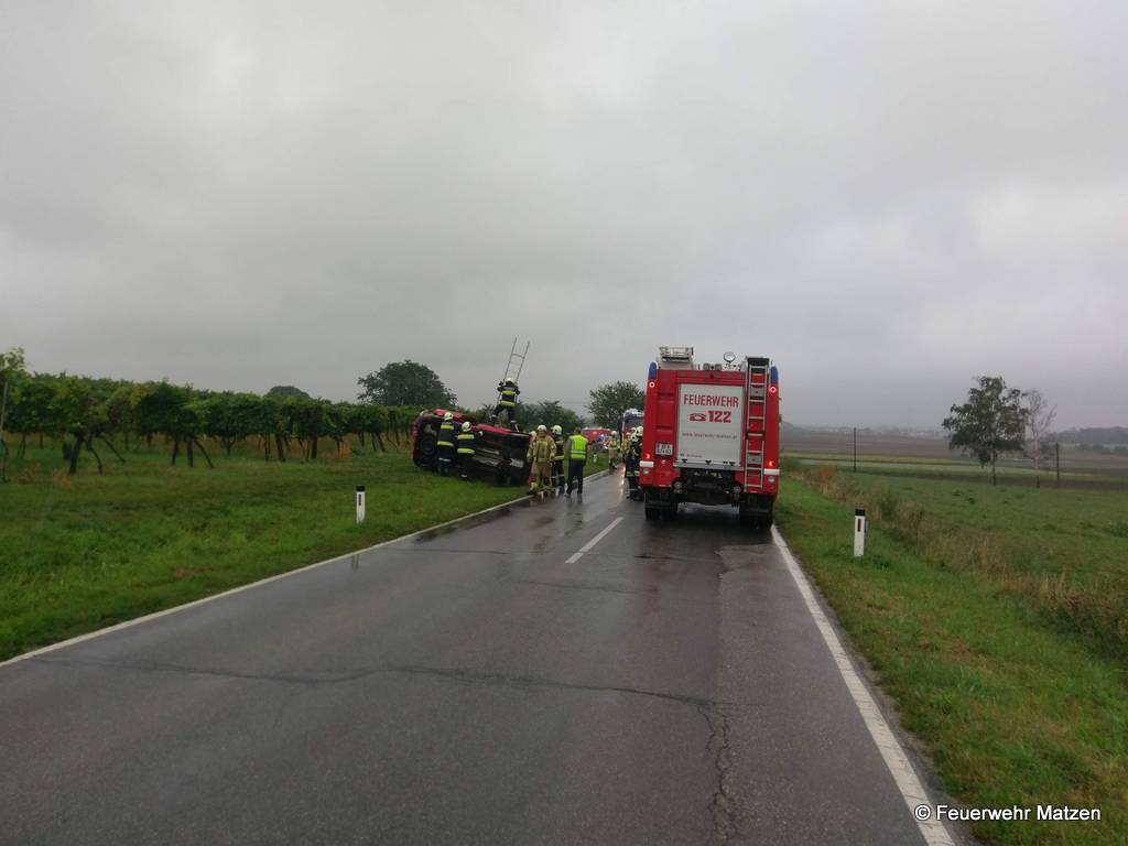 Mit dem Meldebild T2 – Verkehrsunfall mit einer eingeklemmten Person wurde die Feuerwehr Matzen am 07. September 2019 um 17:11 Uhr mittels Sirene, BlaulichtSMS und Pager alarmiert. Laut Meldebild wurde automatisch die Nachbarfeuerwehr Prottes mitalarmiert. Unverzüglich rückten 17 Mann mit 3 Fahrzeugen zum Einsatzort auf die L19 Richtung Prottes aus. Ein PKW kam auf regennasser Fahrbahn in einer Rechtkurve ins Schleudern, rutschte in Folge ins Bankett und kam seitlich im angrenzenden Acker zum Stillstand. Da sich der Fahrer aus eigener Kraft nicht aus dem Fahrzeug befreien konnte, wurden die Feuerwehren mit dem Meldebild Menschenrettung alarmiert. Unverzüglich nach Eintreffen der Einsatzkräfte wurde die Einsatzstelle abgesichert und ein Zugang mittels Steckleitern zum Fahrer aufgebaut. Glücklicherweise konnte der Pkw-Lenker unverletzt mittels Leitern aus dem Wrack gerettet werden. Nachdem es sich nicht um eine eingeklemmte Person handelte konnte die Feuerwehr Prottes wieder abrücken. Nach der Unfallaufnahme durch die Polizei und der Freigabe des Unfallfahrzeuges durch Diese, konnte mit der Fahrzeugbergung begonnen werden. Nachdem das Fahrzeug wieder auf die Räder gestellt wurde, schoben die Florianijünger das Fahrzeug wieder auf die Straße. Mittels Abschleppachse wurde Dieses dann auf einen von der Polizei zugewiesenen Platz verbracht. Nach rund einer dreiviertel Stunde konnten alle Einsatzkräfte wieder einrücken.
