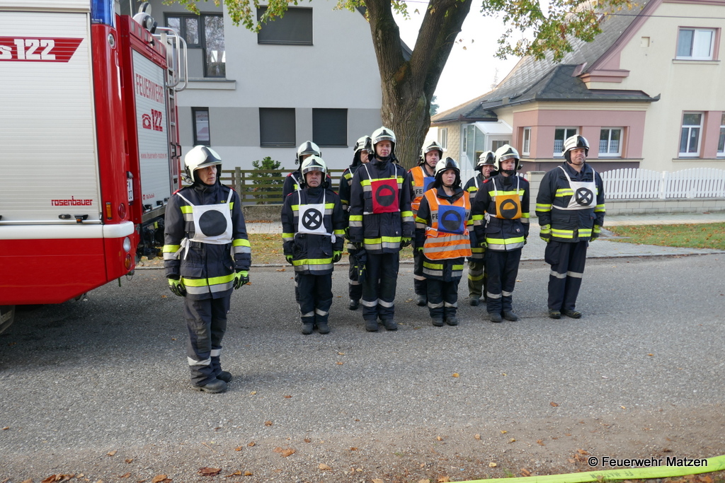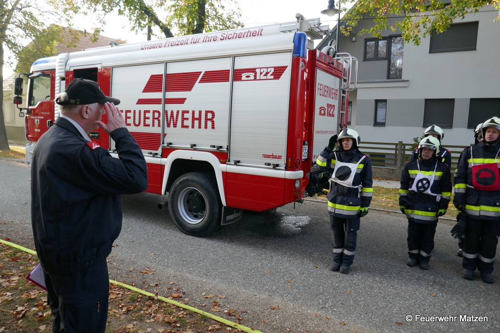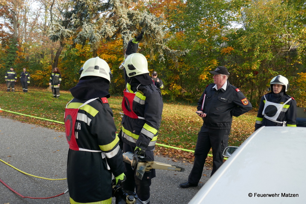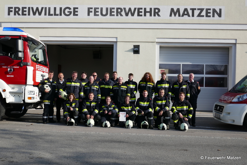 Nach über zweimonatiger Vorbereitungszeit traten 17 Kameraden der Freiwilligen Feuerwehr Matzen am Vormittag des 26. Oktobers 2019 zur Ausbildungsprüfung in Bronze und Gold an. Mitte August starteten die Florianijünger mit der ersten Vorbereitungseinheit. Die Ausbildungsprüfung Technischer Einsatz unterstützt die Ausbildung der Feuerwehrmitglieder und ist deshalb eine wichtige Voraussetzung für ein reibungsloses und zielführendes Zusammenarbeiten bei technischen Einsätzen, wobei kein Wert auf das Erreichen von „Bestzeiten“ gelegt wird, sondern das die Teilnehmer eine sichere und exakte Leistung mit dem eigenem Fahrzeug und Gerät erbringen um den Anforderungen im Einsatz entsprechen zu können. Bei dieser Prüfung wird ein Verkehrsunfall mit eingeklemmter Person simuliert, wobei die Mannschaft aus 10 Personen durch sicheres Arbeiten die Menschenrettung durchführt. Dabei muss die Unfallstelle abgesichert, der Brandschutz und Beleuchtung aufgebaut und die Rettung mittels Spreitzer und Schere in einem vorgegebenem Zeitfenster durchgeführt werden. Zusätzlich müssen definierte Gerätschaften bei geschlossenen Rollos im Fahrzeug gefunden und erklärt werden. Neben den „technischen“ Herausforderungen müssen die Teilnehmer ihr Können auch in der Ersten Hilfe beweisen. Während die Positionen in der Stufe Bronze fix vergeben sind, so werden in der Stufe Gold bis auf die beiden Maschinisten, die untereinander gelost werden, alle restlichen Positionen vor Beginn gezogen. In der Stufe Gold müssen alle Teilnehmer außerdem 20 Fragen aus einem Fragenkatalog richtig beantworten. Unter den strengen Augen der Prüfer konnten die beiden Gruppen die Ausbildungsprüfung mit Erfolg in der vorgegebenen Zeit absolvieren. Das Prüferteam, sowie Feuerwehrkommandant HBI Neubauer Manfred gratulierten den Kameraden für die positiv abgelegten Prüfungen und die gute Zusammenarbeit. Im Anschluss durften die stolzen Florianijünger ihre Abzeichen von Bezirksfeuerwehrkommandant-Stellvertreter BR Jobst Robert entgegen nehmen.