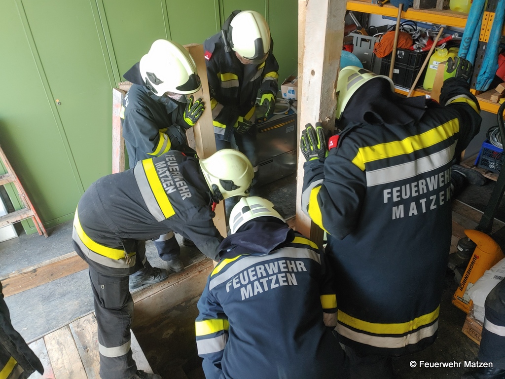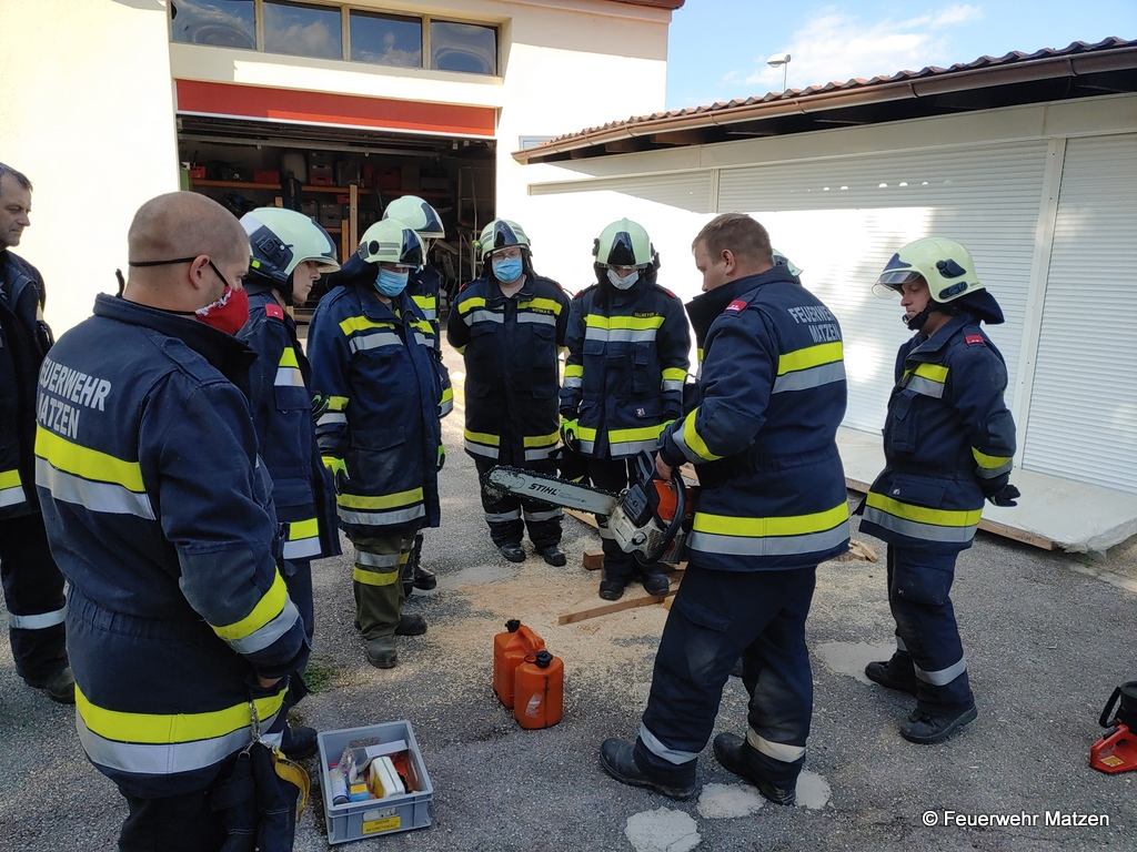 Greifzug, Sägen und Pölzen wurde in einem Stationsbetrieb während der Monatsübung im Mai geschult. In verschiedenen Stationen wurde der Umgang mit dem Greifzug, der Ketten- sowie der Rettungs-säge vertieft. Als letzte Station musste die Montagegrube in der Werkstatt gepölzt werden.